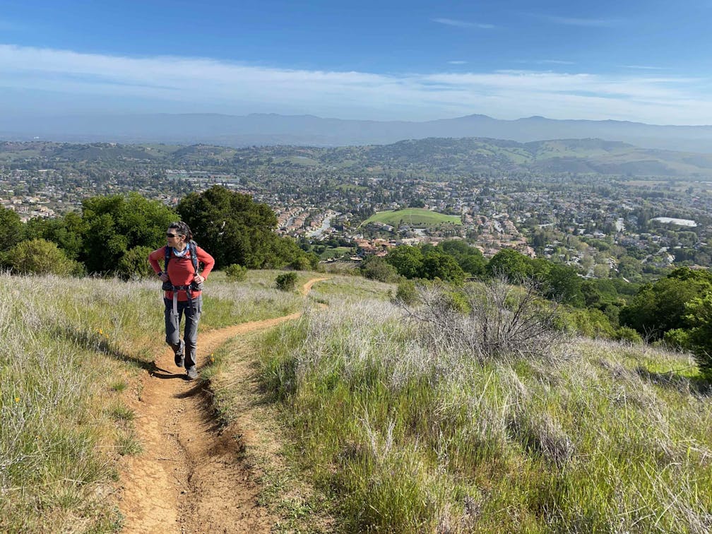 The trail lopes along a pretty creek, ravines, and grasslands filled with buttercups and lupine. The narrow dirt trail is mostly shaded, with slants of sun, and every now and then you can see Mount Hamilton to the northeast. At the 2.8-mile mark, turn left onto Prospect Trail, climbing steeply for the next 0.2 mile beside fiddleneck, popcorn flower, and poppies. At the top of the hill there’s a picnic table overlooking the Santa Clara Valley, San Jose, Santa Cruz Mountains, Black Mountain, Mission Peak, Mount Hamilton, and the Diablo Range.