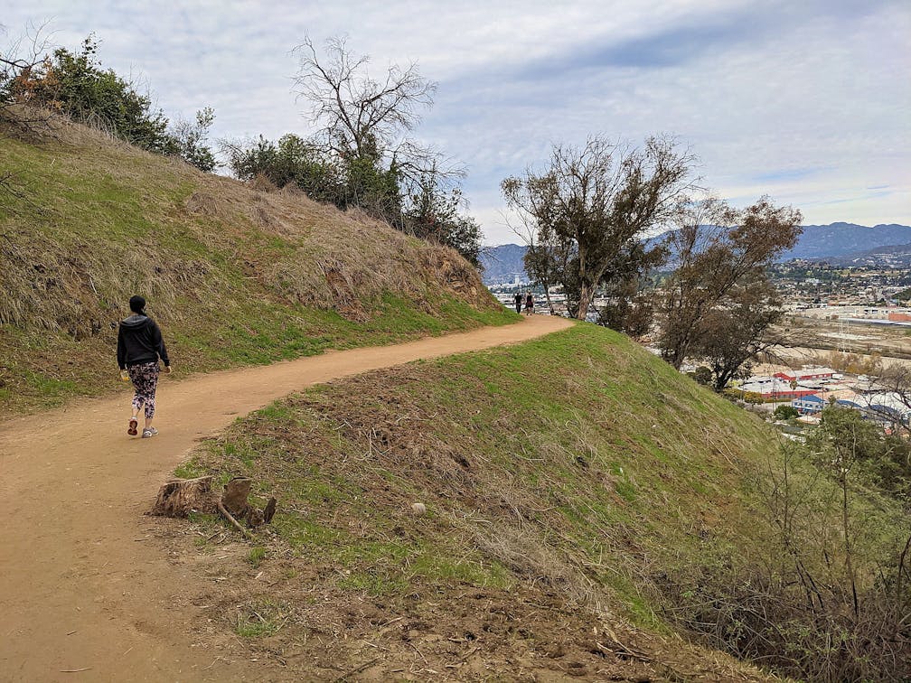 Park along Elysian Park Drive north of Stadium Way and find the trailhead at the eastern edge of the adjacent lawn past some palm trees. The trail immediately enters a shady arboreal wonderland, dominated by eucalyptus. After the park opened in 1886, over 150,000 trees were planted, most of which were the aforementioned inexpensive import from Australia. The grove is dense and creates a peaceful stroll, before the path becomes exposed and awesome city panoramas over the 5 Freeway and LA River come into view.