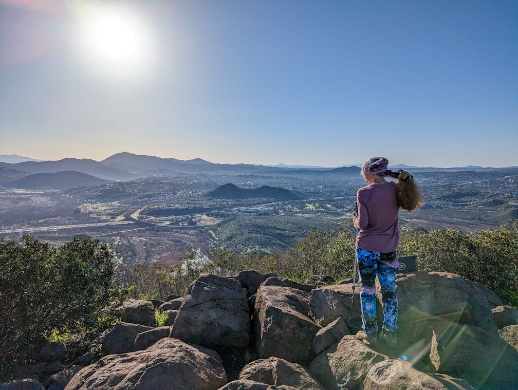 Enjoy a brief shaded portion as you dip into the canyon and cross a small, charming footbridge over Felicita Creek and amid vibrant green riparian flora. At the 1.75-mile mark, hop off the Coast to Crest Trail at the junction and head right onto the summit trail. Ignore the next trail on your right and continue up the rocky path wrapping around the mountain. Views are expansive, of both the surrounding chaparral scenery and the luxurious homes. Ignore a spur trail at the 2.5-mile mark and continue south as the ascent gets a little steeper, hugging a fence and water tower as you near the park’s apex.
