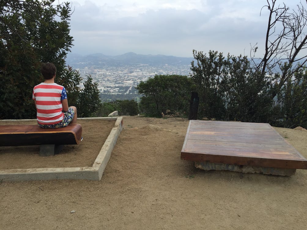 In 2015 a group of artists used reclaimed wood from a former Griffith Park wildfire to build a beautiful teahouse within steps of the park’s seldom-visited Taco Peak. The teahouse is gone but a bench remains, and the views from it are simply outstanding.