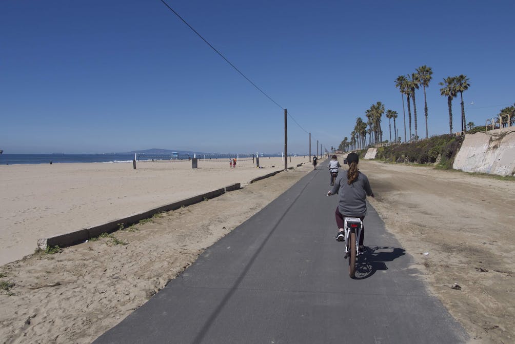 With a paved bike trail between the Pacific Ocean and Bolsa Chica Ecological Reserve, Huntington Beach is a cruising paradise. Its namesake bike trail runs along the edge of the beach and through grassy hills and palm tree–lined beach bluffs.