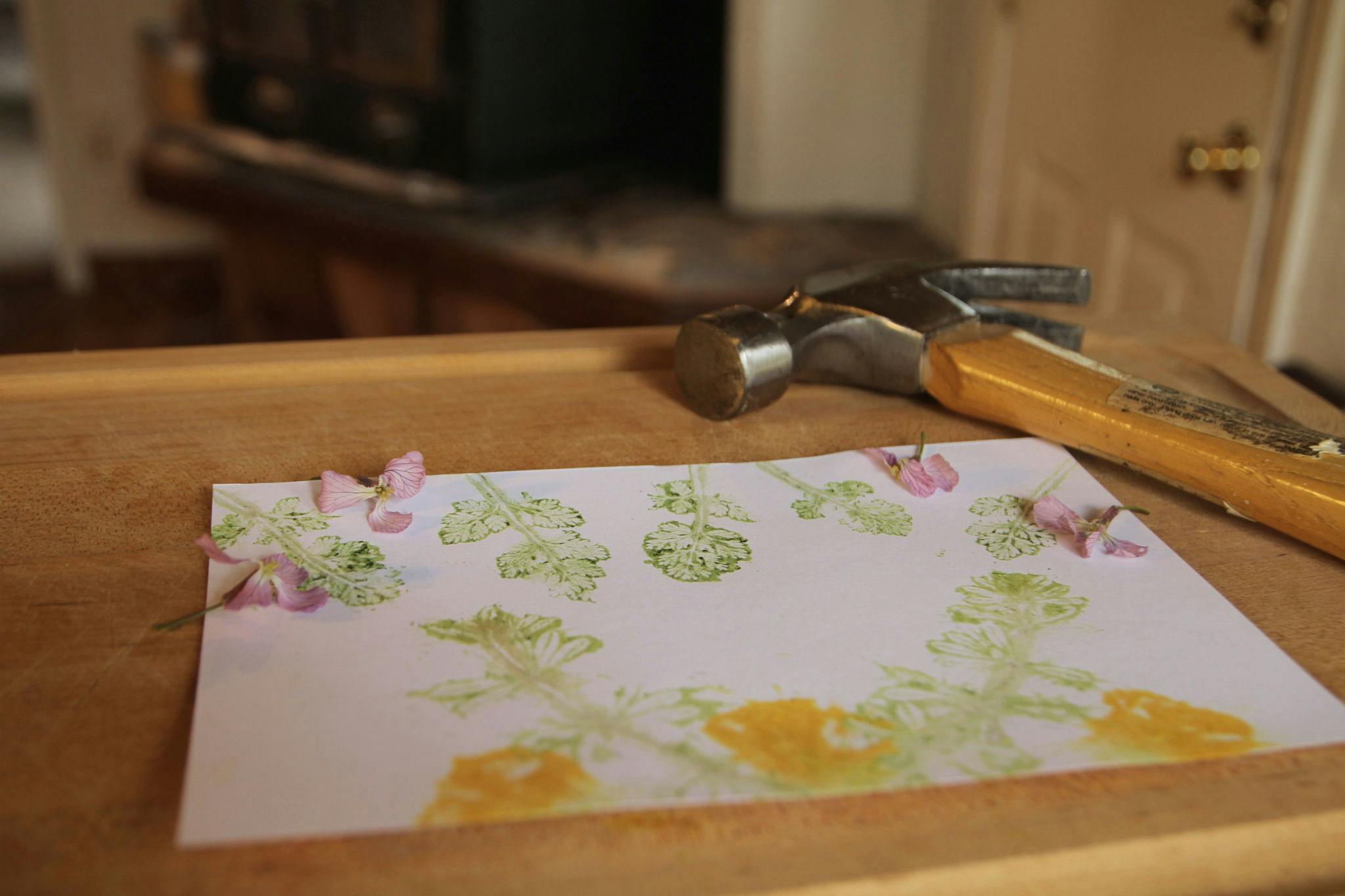 Fill your indoor space with reminders of the natural world by creating leaf art prints. Our friend Ellen Rawley (follow her @wild_still) gave us this idea. You’ll need leaves and flowers, paper (card stock is best, but computer paper will work!), a hammer (a mallet is best, but a metal hammer works too), and a stable work surface you don’t mind getting banged up, like a cutting board. First, gather your materials from directly around your home whether that’s picking leaves in your front yard or harvesting from between the cracks in the sidewalk. While some flowers make good prints, greens and leaves are more consistently impressive.