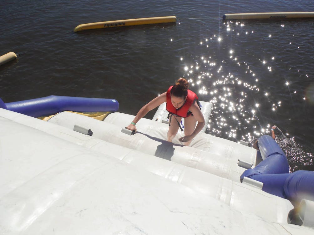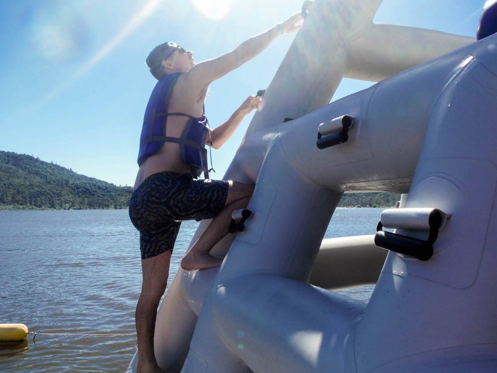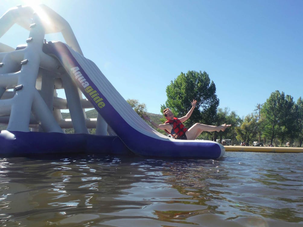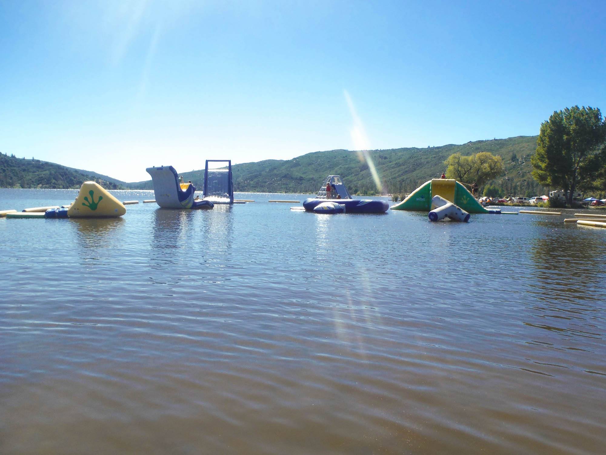 The Splashing Eagle Waterpark at Lake Hemet proves waterparks aren’t just for kids. This action-packed floating waterpark, just offshore in the 470-acre lake nestled in the San Jacinto Mountains, presents plenty of adult-size challenges. Challenge 1: You have to swim through the
