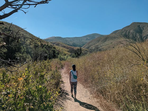 View![Hiker on a wide open dirt trail at Long Canyon in Simi Valley]()