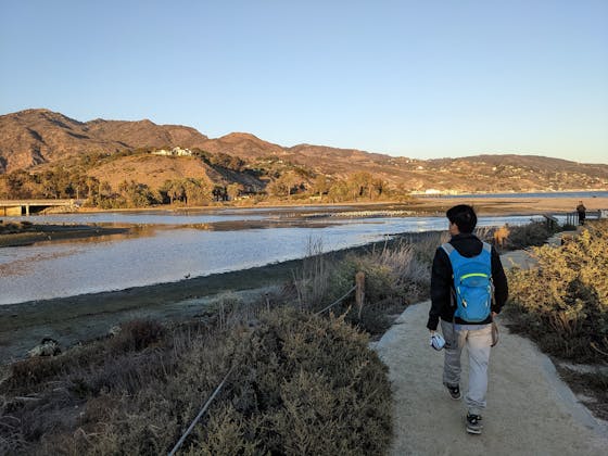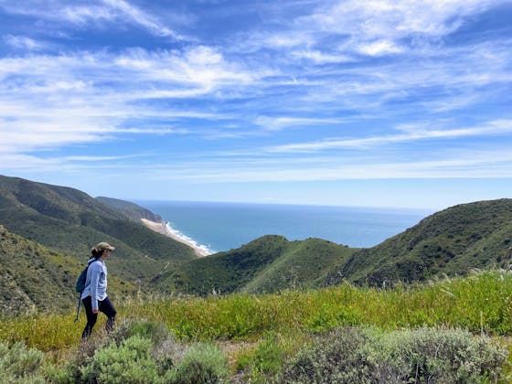 VIEW![A hiker walks towards Leo Carrillo Beach via a hiking trail in Malibu]()