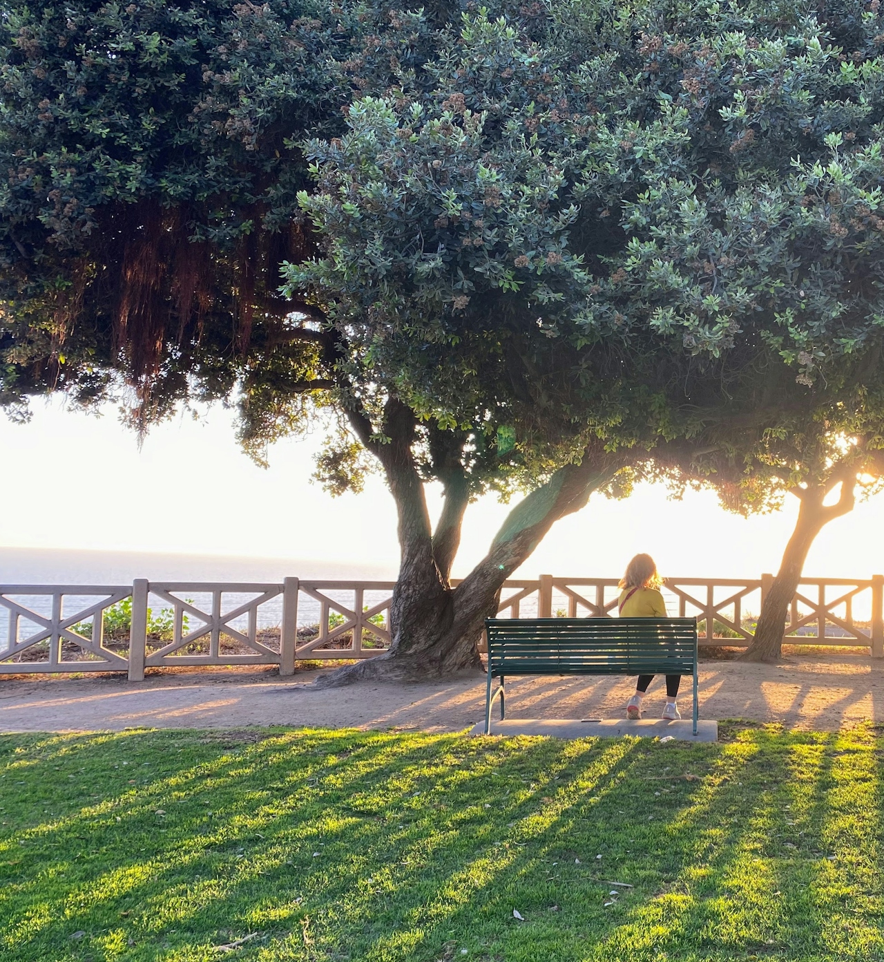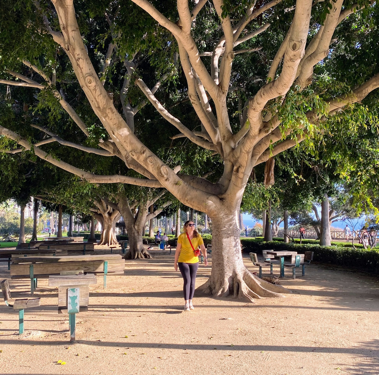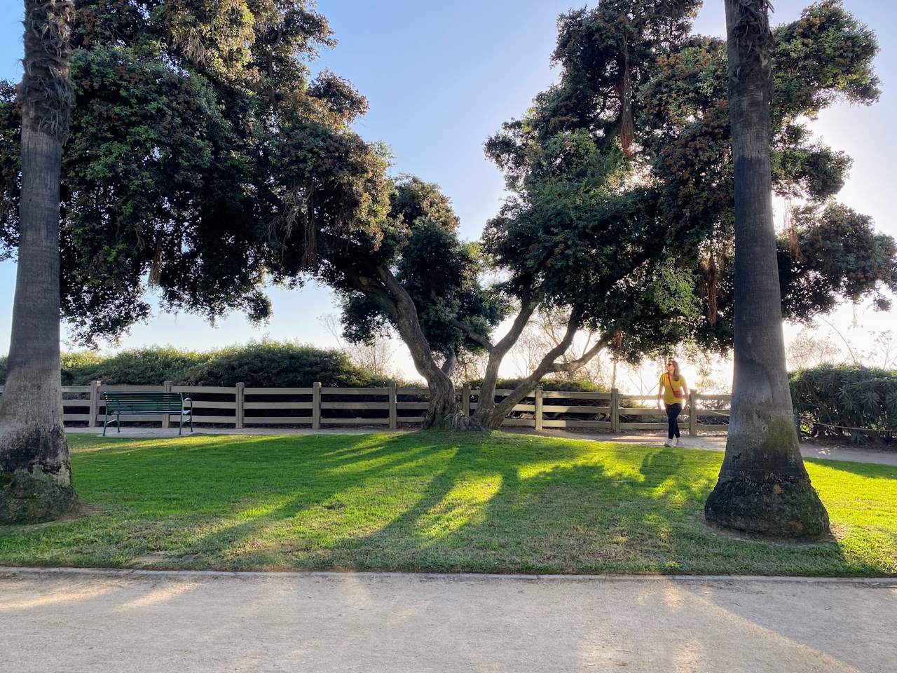 While it’s tempting to gaze out at the ocean the whole time, the park itself, a Santa Monica landmark, has plenty of notable sights. Some of our favorites include a community rose garden, a Craftsman-style pergola, the sphere-like Gestation III art sculpture, and a picnic area shaded by enormous fig trees. You’ll also pass striking agave plants and an abundance of eucalyptus, pine, and palm trees that add to the park’s charm.