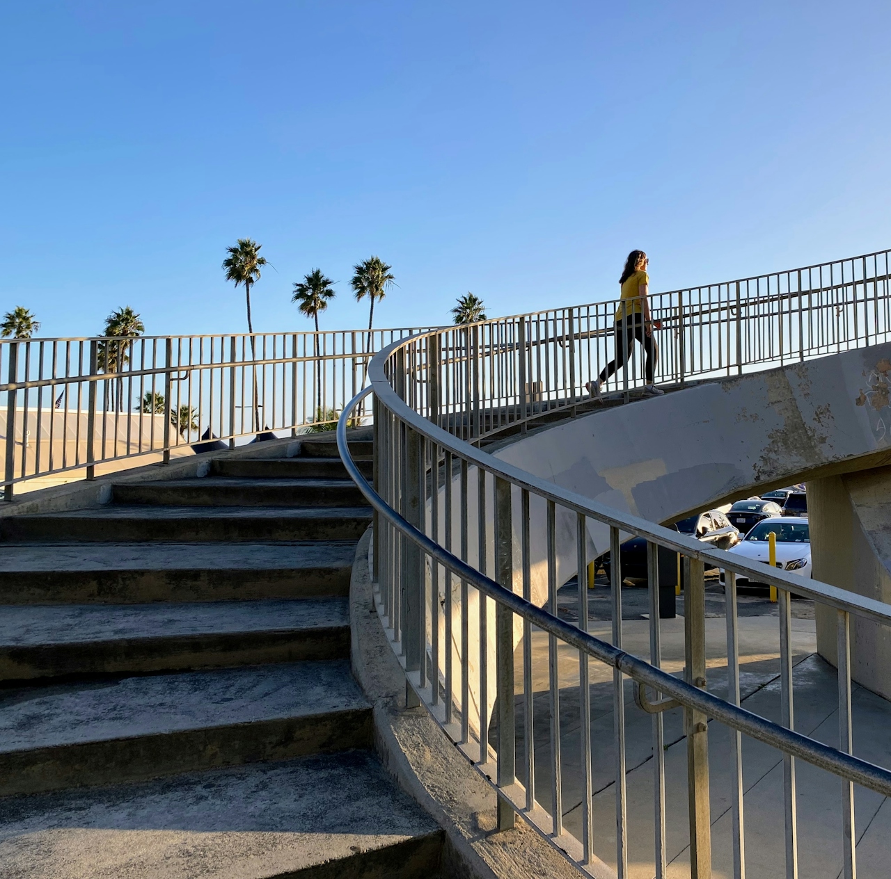 At California Avenue head down the pedestrian path of the California Incline. Midway down, take the pedestrian bridge across the Pacific Coast Highway to reach The Strand beach path.
