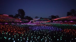 Over 100,000 stemmed spheres blanket the landscape, starting as a subtle shimmer while the sun settles across the horizon. As darkness falls, the hills blossom into a technicolor mirage of jeweled flowers unfurling as far as the eyes can see.