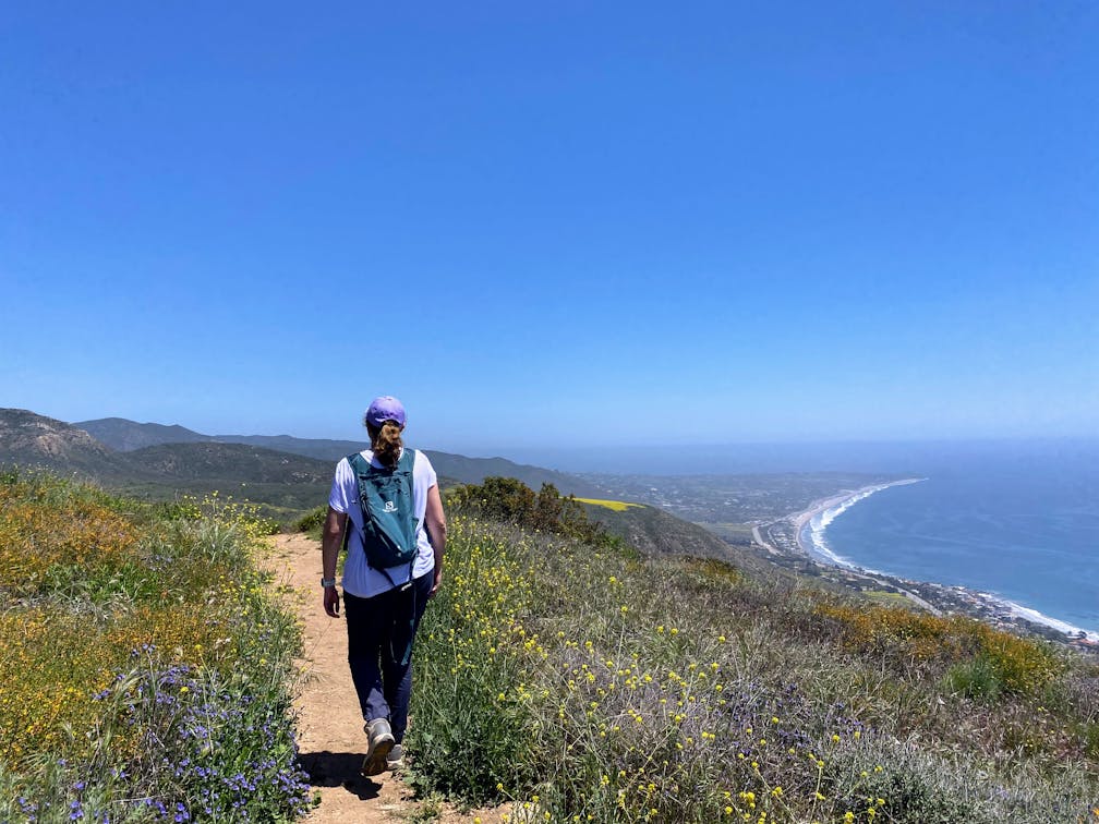 Continue onto the East Meadow Trail, then keep left to continue on the Ocean View Trail. Here the trail dramatically edges the bluff, delivering dreamy views of the ocean and the curvy Malibu coastline. On clear days, you can see Catalina and the other Channel Islands in the distance.