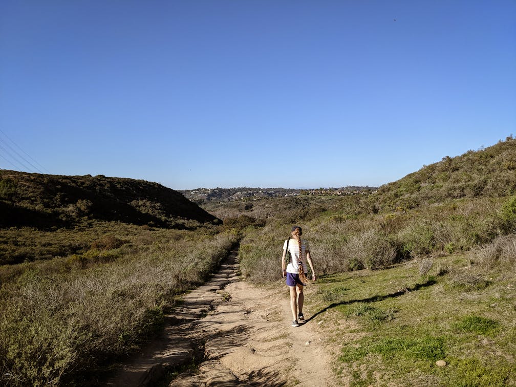 Named after Levi Gonzales, a Portuguese farmer who owned the land in the 1800s, the green space’s main trailhead sits adjacent to the Torrey Highlands Dog Park on the east side of the road (a wonderful post-hike spot to tire out those energetic pups!). Admire the immediate canyon vistas and take the narrow Torrey Pines Loop Trail (yes, you will indeed see the majestic trees on your journey) as it quickly descends through thick shrubs into the canyon, transporting you far away from the surrounding suburbia. You’ll trek through chaparral staples like sugarbush, sagebrush, and coyote bush.
