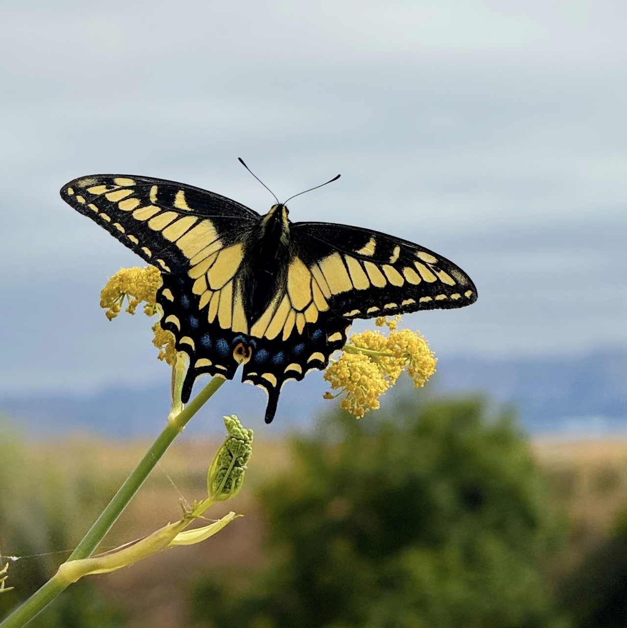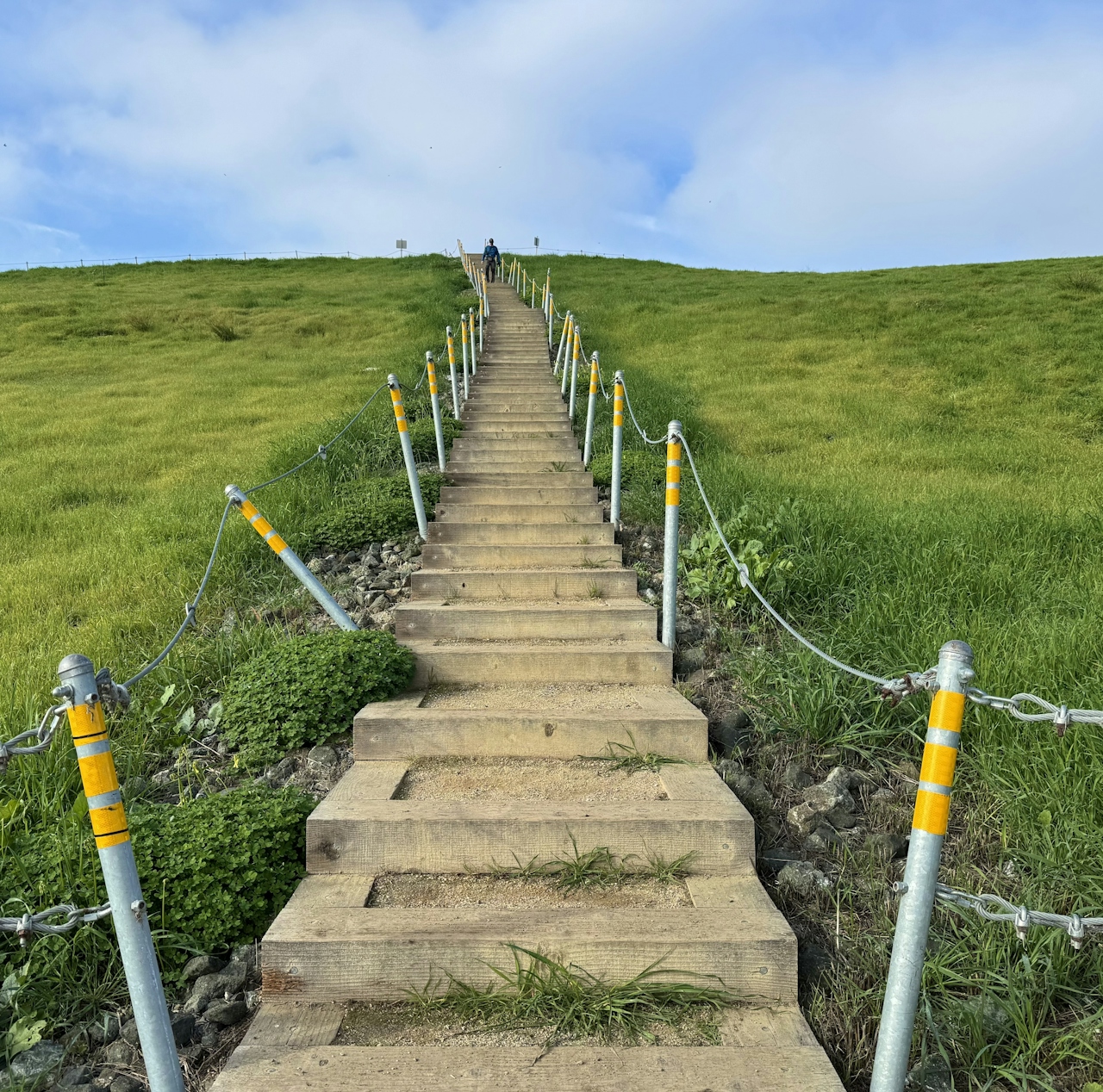 Once hikers have completed their loop, they can retrace the route back to the water fountain, then turn right. Climb up the wooden staircase to get a bird’s–eye view of the salt ponds and Don Edwards Wildlife Refuge in the distance. Enjoy the grassy hilltop with Canada geese and swallowtail butterflies, then retrace the route back to the street.