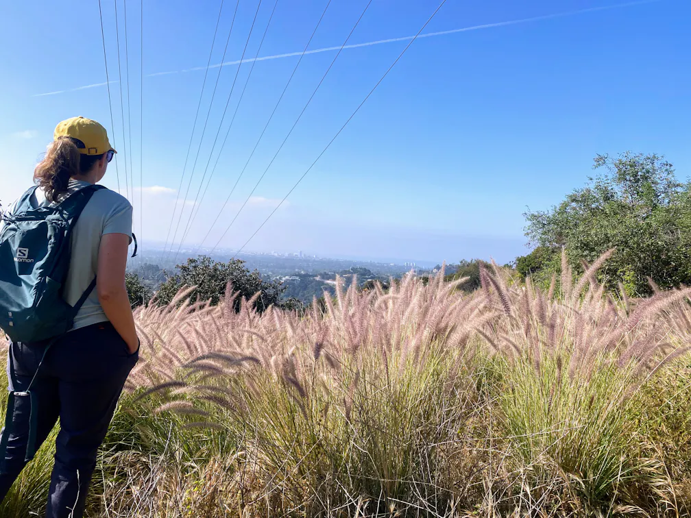 Start on N. Kenter Ave., where a paved fire road lined with showy fountain grass climbs past a transmission tower. Almost immediately, views open toward Santa Monica and its shimmering blue bay.