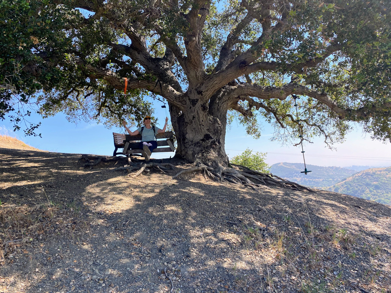 In the open landscape stands a sprawling coast live oak with two swings hanging from its branches—an unexpected place to pause on this mostly shadeless hike, sway, and take in the view.