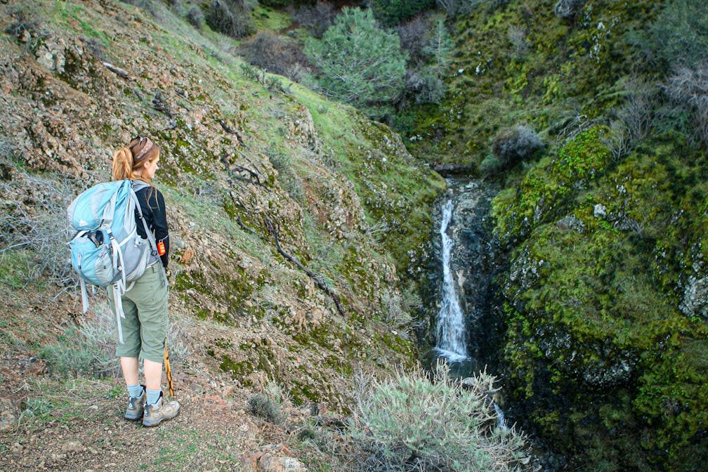 Follow the rushing creek before ascending an open slope that offers uninterrupted views of the Irish-green canyons and hills leading to Mount Diablo’s summit. Then take Middle Earth Trail, a narrow path that ducks through manzanitas, until it links up with the Falls Trail, which skirts the side of the mountain. Parts of this path seem better suited to goats, so take your time and watch your step, especially with recent rains. The upward climb rewards with increasingly better perspectives on the falls. Take a break on a grassy knoll and enjoy huge views of the northern valley.
