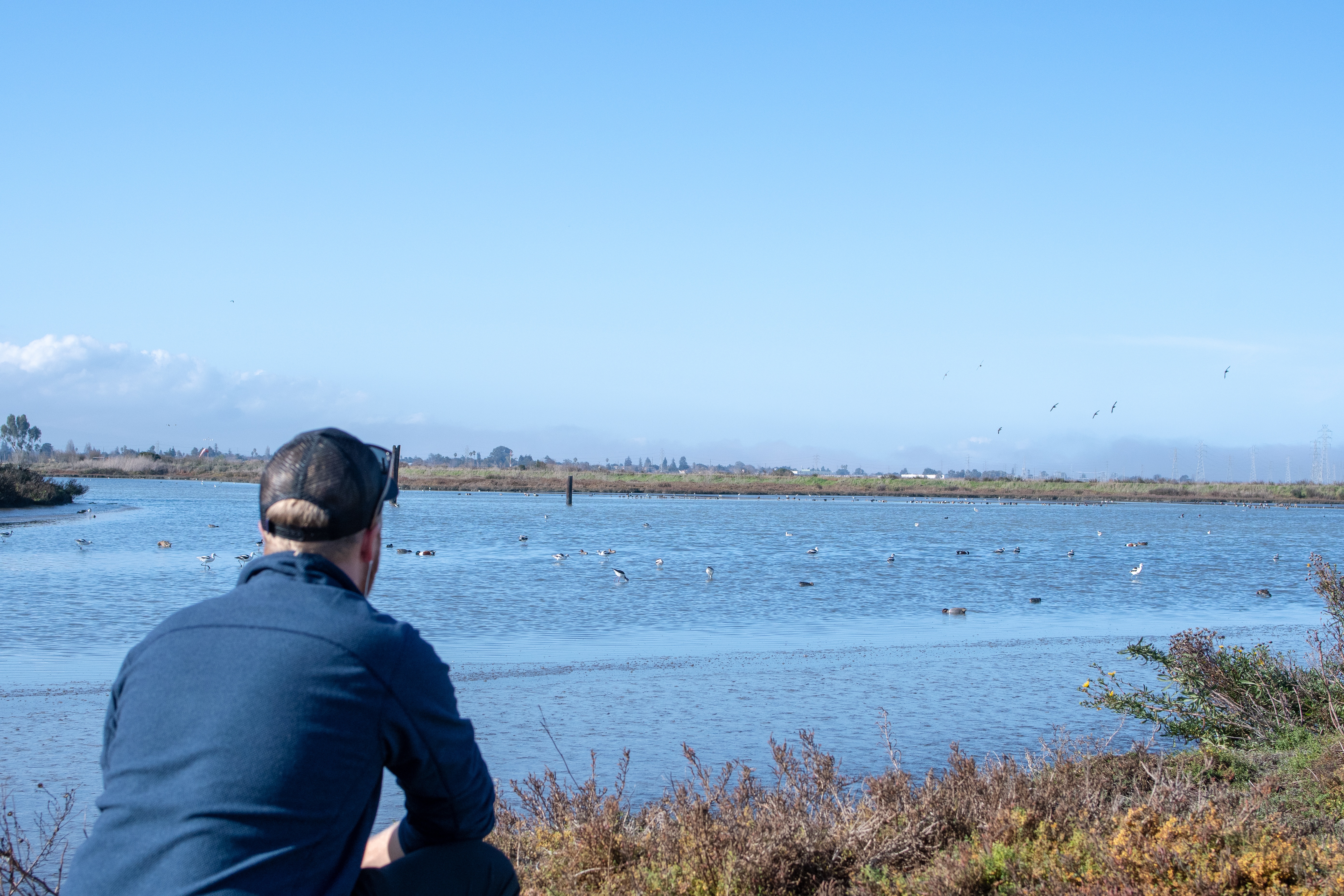 Birds spotted: burrowing owl, Anna’s hummingbird, black-necked stilt, American avocet, sanderling, greater yellowlegs, long-billed curlew, American coot, snowy egret, great egret, great blue heron, northern shoveler, northern pintail, gadwall, mallard, pied-billed grebe, American wigeon, song sparrow, white-crowned sparrow, marsh wren, greater and lesser scaup, ruddy duck, green-winged teal, bufflehead, Canada goose, red-tailed hawk, northern harrier, American crow, common raven, double-crested cormorant, American white pelican, western meadowlark.