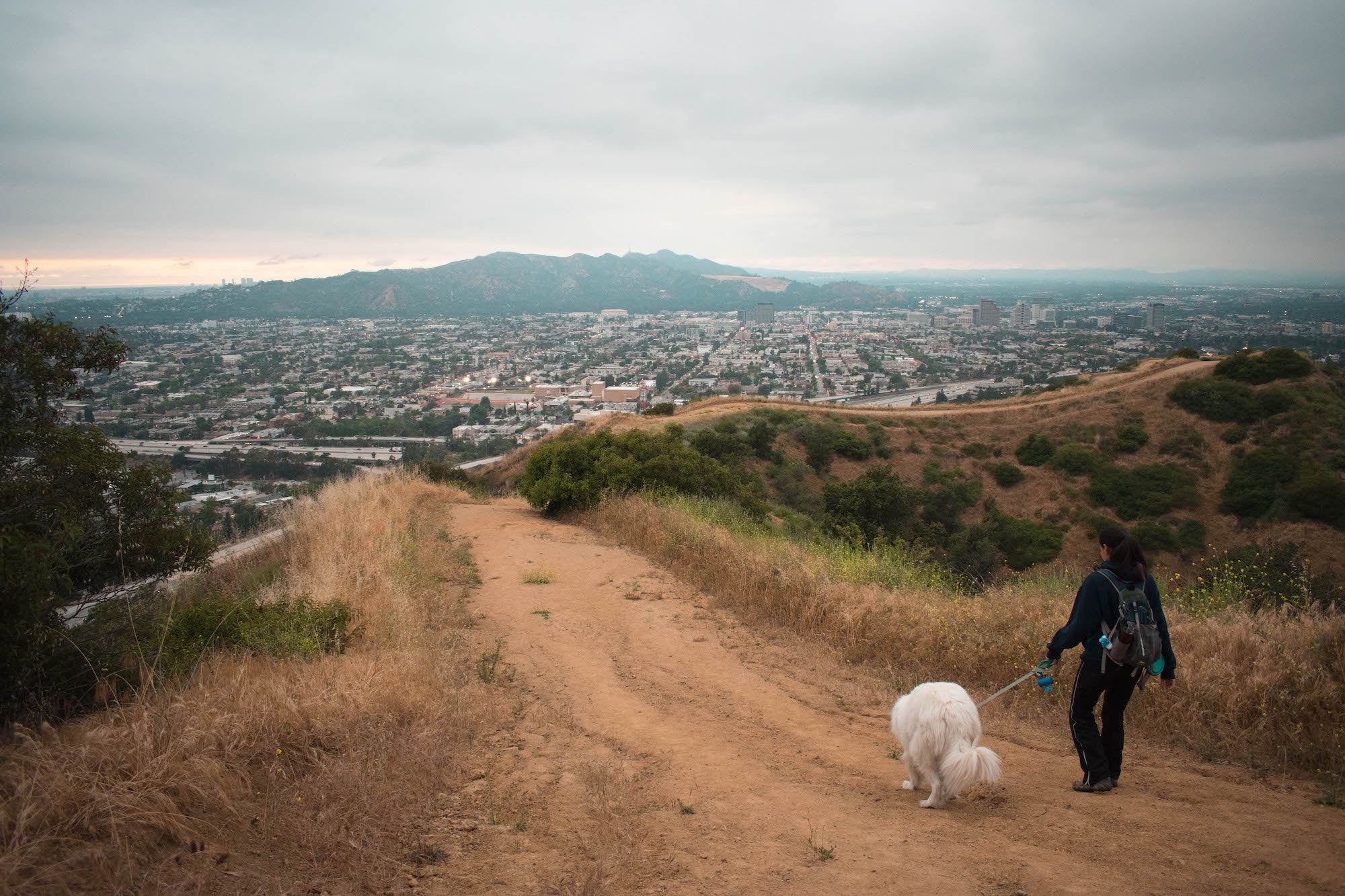 As for scenery, it’s more about views than immediate surroundings. On a clear day you can see all the way to the ocean, and even on cloudy days the views of downtown Los Angeles and Burbank are stunning, especially if you time your hike to see the sunset and watch the city morph into a sparkling display of lights. There’s no shade on the trail, so it’s a great choice for an early or late hike. It can even be done as a moonlight hike, because the trail never closes. You’ll come across a couple of unofficial spur trails, but the “official” trail is a wide-open fire road. Just follow it until it ends, and then head back the way you came. Colorful wildflowers and the occasional tree decorate the otherwise mostly dry urban trail, adding just enough nature to let you feel like you escaped from the city. That freeway din? Think of it as a roaring river or waterfall. Additional bonus: Leashed dogs are welcome to use this trail, in case you want a change of scenery for your evening dog walk. A perfect antidote for those midweek blues!