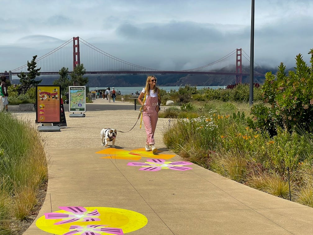 Her artistry at Tunnel Tops comprises colorful ground murals of three Presidio native plants: checkerbloom, the Chilean strawberry, and the state flower, the California poppy.