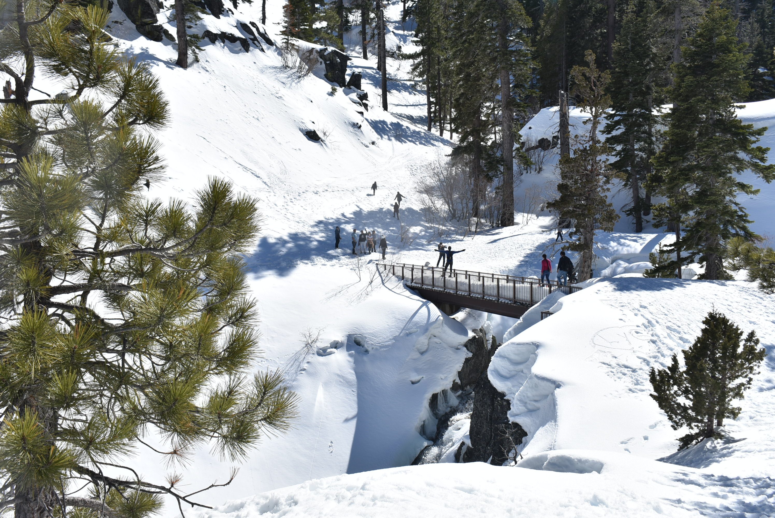 Even in the snow people make the trip to see the 50-foot falls cascading through snow-covered granite. This is a good turnaround point for those who just want to see the waterfall. Some people continue on to frozen Eagle Lake—just be mindful of conditions. Cross the footbridge above Upper Eagle Falls (the bridge is packed with feet of snow so the top of the rail only comes to your knees: cross carefully!).